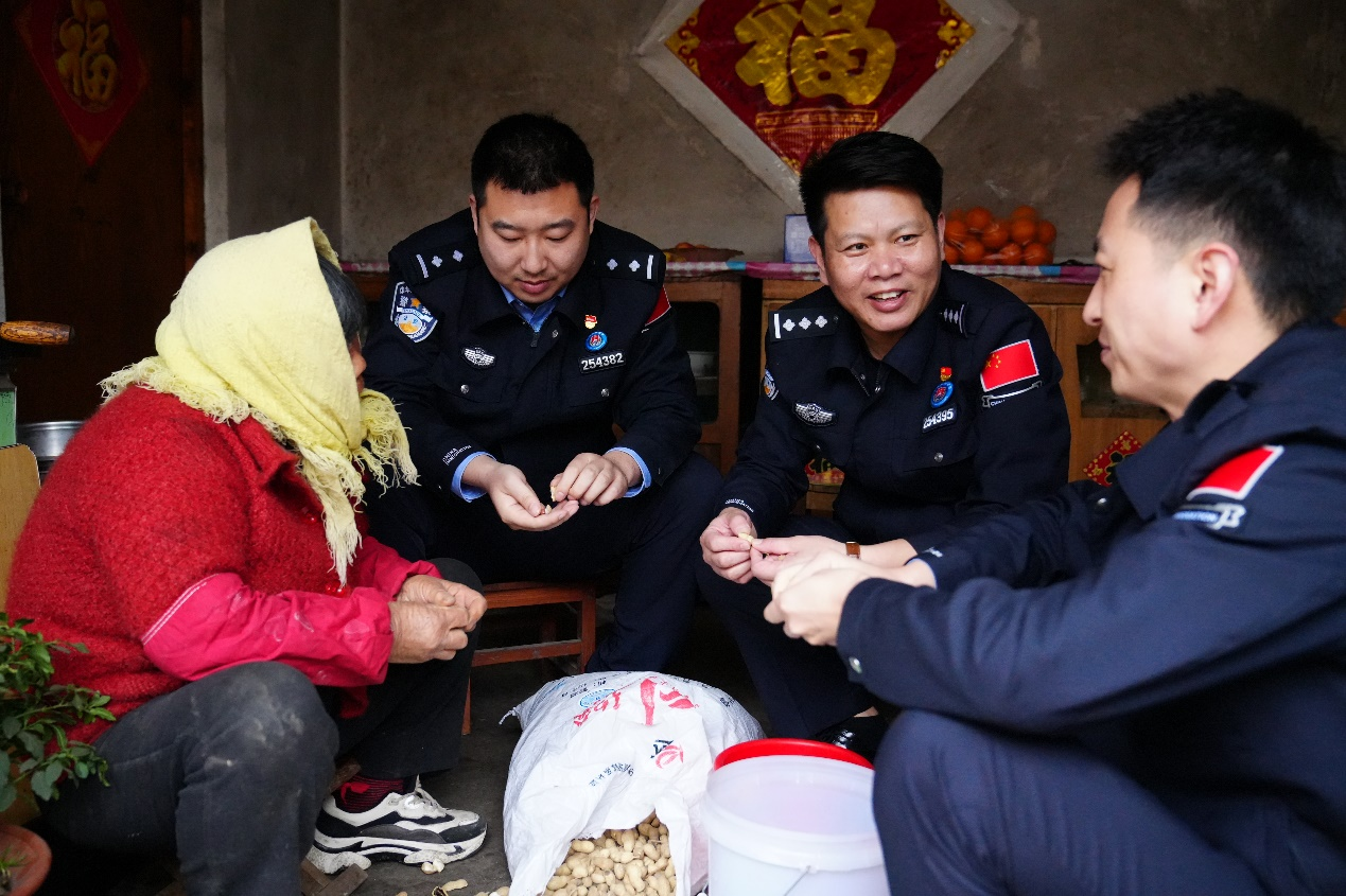 據(jù)了解,董翠蓮老人患有眼疾,孤身照顧身有殘疾的老伴已有20余年。當(dāng)民警楊曉龍、胡云龍、李虎一行走進(jìn)董翠蓮老人家中時(shí),老人正在屋里剝花生?!按竽?,我們來(lái)幫您!”民警們立即放下手中的慰問(wèn)品,圍坐在老人身邊剝起花生來(lái)?!皠傁峦暧辏L(fēng)大,您年齡大了出門(mén)不安全,有什么需要給我們打電話。”“最近用電、用氣一定要注意安全!”……句句關(guān)懷、聲聲叮嚀讓老人感動(dòng)不已。盡管雨后的天空陰沉沉的,但警民嘮嗑的笑聲在小院里此起彼伏?!斑@些孩子比親兒子還貼心,經(jīng)常來(lái)看我和我老伴,這次又送來(lái)這么多東西?!倍渖徖窬氖植蛔】滟?。