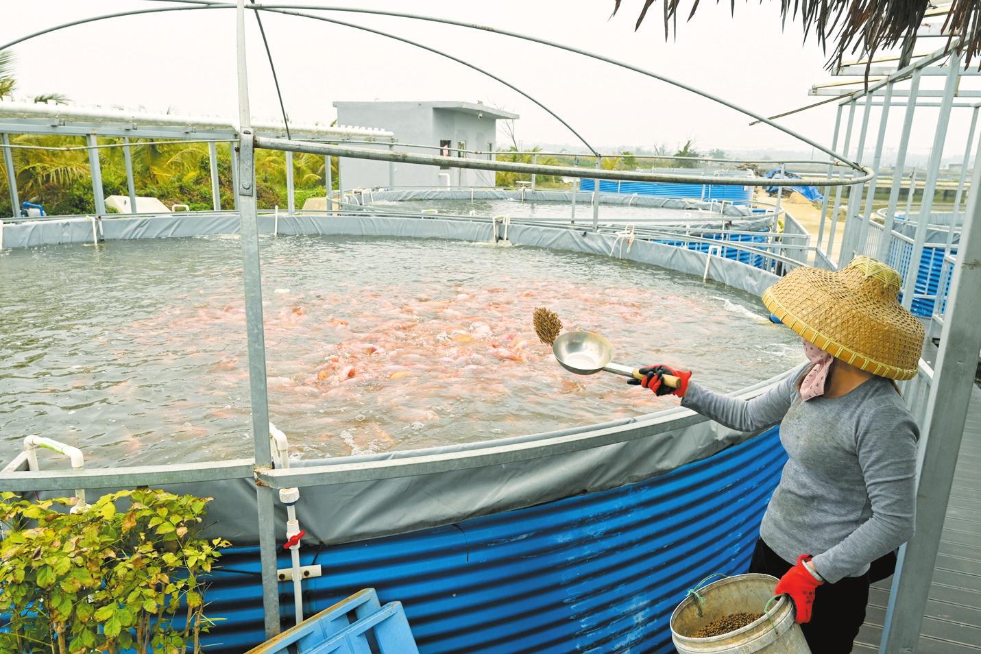 海口枷椗山現(xiàn)代農(nóng)業(yè)工廠化養(yǎng)種產(chǎn)業(yè)基地內(nèi),工作人員在喂養(yǎng)咸淡水紅鯛魚。記者 石中華 攝
