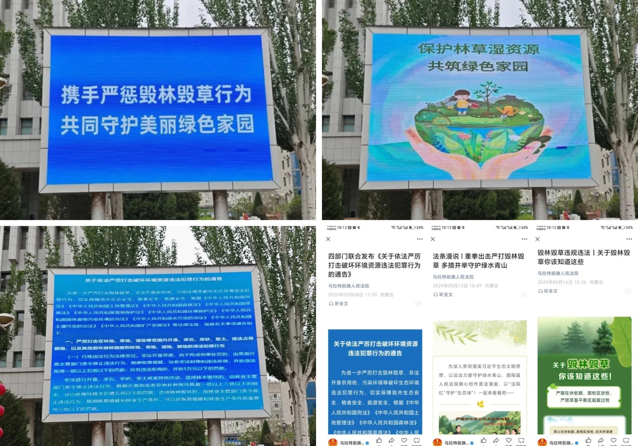為鞏固宣傳成效,營(yíng)造濃厚宣傳氛圍,烏拉特前旗人民法院開(kāi)展了形式多樣的宣傳舉措。一是利用戶(hù)外LED電子顯示屏圍繞毀林毀草主題每日循環(huán)播放圖片及視頻;二是同時(shí)在5個(gè)基層法庭公示欄等顯眼位置張貼《關(guān)于嚴(yán)厲打擊毀林毀草違法犯罪行為的通告》等海報(bào)10余張;三是積極利用微信公眾號(hào)等多媒體平臺(tái),轉(zhuǎn)發(fā)有關(guān)毀林毀草的相關(guān)文章及法律條文,引導(dǎo)群眾從“被動(dòng)守法”轉(zhuǎn)向“主動(dòng)護(hù)綠”。