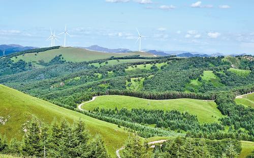 5月24日拍攝的豐寧滿族自治縣的森林和風電場。記者 陳寶云 攝