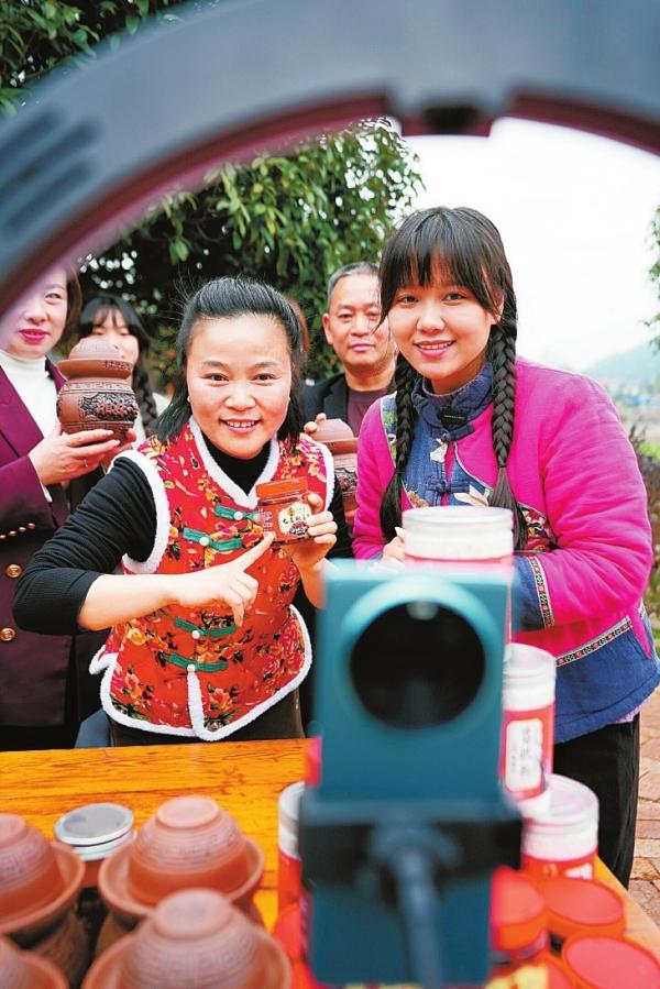 “新農(nóng)人”曾慶歡(右)將手機當作新農(nóng)具,利用直播帶貨幫助村民銷售農(nóng)特產(chǎn)品。記者 易昂 攝