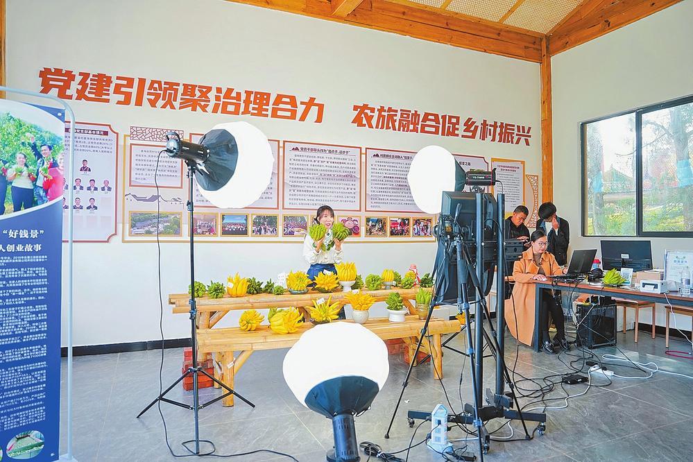 在墨江縣曼海創(chuàng)業(yè)村落,主播正在直播銷售佛手、香櫞。