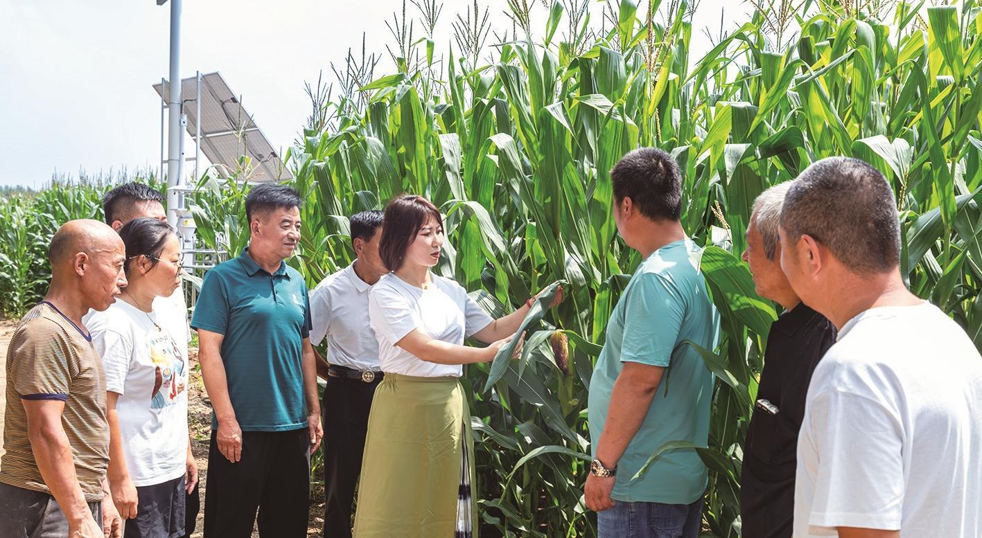 梨樹縣鳳凰山農(nóng)機農(nóng)民專業(yè)合作社理事長韓鳳香正在和村民們查看玉米授粉和長勢情況。高鴻 攝