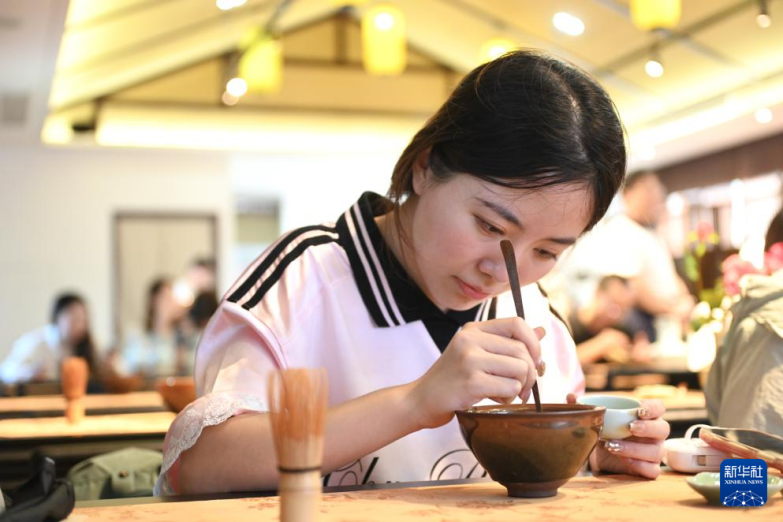8月5日,在浙江省杭州市余杭區(qū)徑山村,一名游客體驗傳統(tǒng)點茶。記者 毛竹 攝