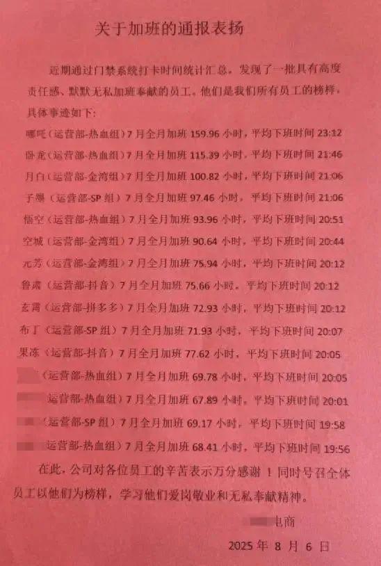 近日,某網(wǎng)友在社交平臺(tái)貼出了一則某電商公司《關(guān)于加班的通報(bào)表?yè)P(yáng)》。表?yè)P(yáng)信中顯示,有員工7月份加班159.96小時(shí),平均下班時(shí)間為23點(diǎn)12分。