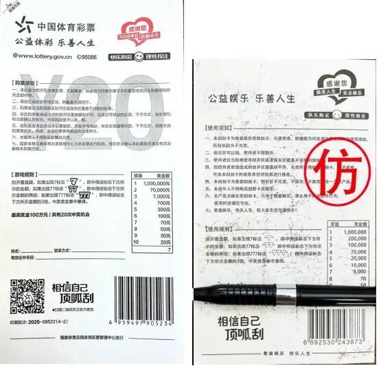 多地發(fā)生兌獎(jiǎng)鬧劇,上演了人生倍速版“大起大落”。這些“整蠱彩票”都以即開型體育彩票為主。正規(guī)合法的即開型體育彩票到底長啥樣?根據(jù)國家體育總局體育彩票管理中心發(fā)布的聲明,即開型體育彩票使用環(huán)保紙張和油墨,綠色、健康、易刮開; 保安區(qū)和刮開區(qū)均有覆膜,票面印有防偽裝飾紋,圖案完整;票面印有體彩+頂呱刮標(biāo)識及面值金額,刮開后的游戲區(qū)域有防偽底紋,且游戲符號、獎(jiǎng)金標(biāo)志清晰易辨別。票背 印有發(fā)行機(jī)構(gòu)、公益金貢獻(xiàn)金額和官方網(wǎng)址等信息。