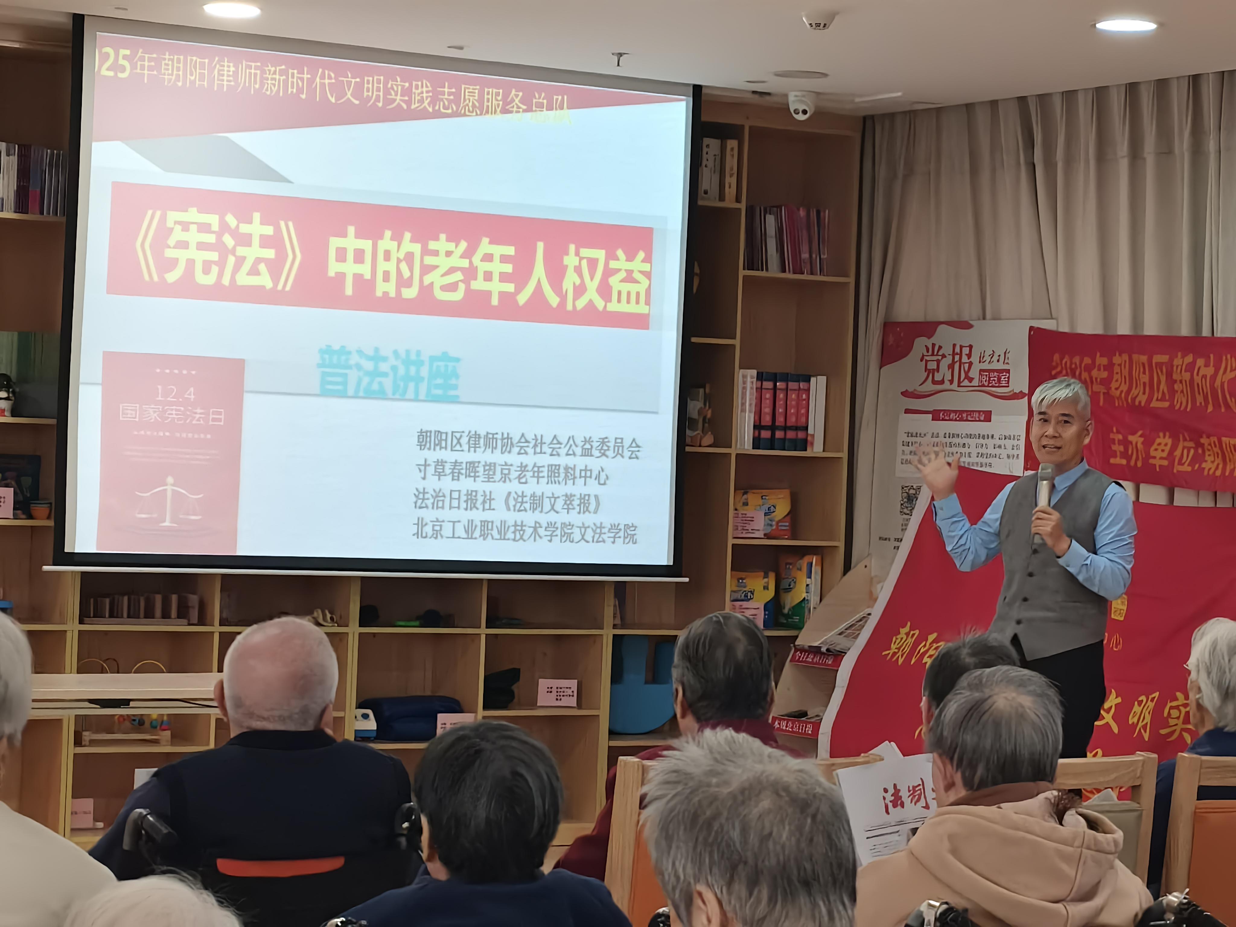 普法現(xiàn)場采用“憲法條文解讀+典型案例剖析”模式,讓抽象法律知識轉(zhuǎn)化為老年群體可感知、可運用的維權(quán)工具。朝陽區(qū)律師協(xié)會公益與社會責任委員會副主任吳廣松、王躍兩位律師從不同維度為公寓老人送上“法治大餐”。他們圍繞人身自由權(quán)、人格權(quán)、住宅權(quán)、社會保障權(quán)等核心權(quán)利,用通俗語言闡釋“權(quán)利是什么、邊界在哪里”;同時聚焦老年生活實際場景,分析了財產(chǎn)處置(立遺囑權(quán))、個人隱私權(quán)、被贍養(yǎng)權(quán)、親情探望權(quán)、就醫(yī)決策預囑權(quán)等8項實踐層面的常見權(quán)益,并詳細說明侵犯這些權(quán)利可能面臨的民事賠償、治安處罰甚至刑事追責后果,引導老年人既要珍視權(quán)利,也要學會在權(quán)益受損時勇敢維權(quán)。