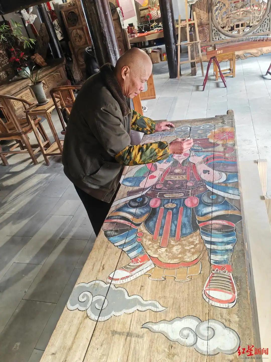 2月10日上午,“萬(wàn)千氣象看四川”大型主題采訪活動(dòng)走進(jìn)四川南充市閬中古城,在古城北街的門(mén)神畫(huà)展示中心,省級(jí)非物質(zhì)文化遺產(chǎn)“閬中門(mén)神畫(huà)”傳承人張桅正在店里一塊木門(mén)板上創(chuàng)作門(mén)神畫(huà)。不同于很多地方是貼門(mén)神畫(huà),閬中的門(mén)神是直接“畫(huà)”到大門(mén)上去的,色澤古樸,栩栩如生。