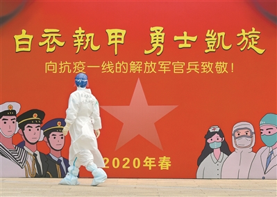 上圖:4月5日,在武漢泰康同濟(jì)醫(yī)院,護(hù)送一名新冠肺炎治愈患者出院后,軍隊(duì)支援湖北醫(yī)療隊(duì)隊(duì)員葉洪江從院區(qū)內(nèi)的展板前走過(guò)返回病房。