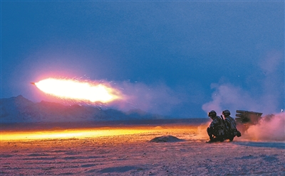圖④:火箭炮分隊(duì)夜間實(shí)彈射擊訓(xùn)練。