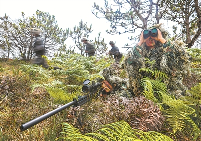 圖③:戰(zhàn)術(shù)演練中,擔(dān)當(dāng)狙擊手的新戰(zhàn)士占領(lǐng)有利地形,掩護(hù)突擊組行動。