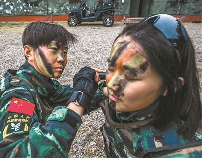 圖⑤:演練前,特戰(zhàn)隊(duì)員相互涂抹油彩進(jìn)行偽裝。