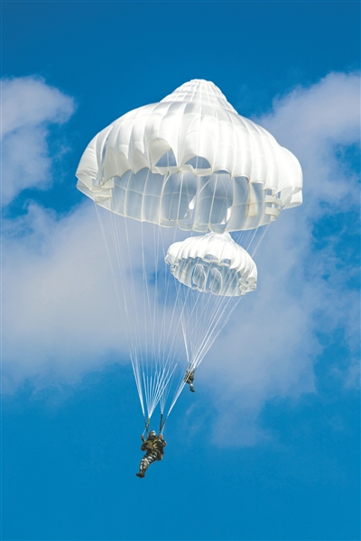 飛抵預(yù)定空域,在抗“藍(lán)軍”反空降火力掩護(hù)下,裝備物資首先投放,全副武裝的學(xué)員緊隨其后實(shí)施集群傘降,朵朵傘花在天空競相綻放。