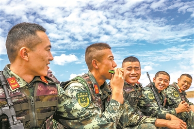 圖④:休整時(shí),下士趙發(fā)(左二)吹奏口琴為戰(zhàn)友們緩解壓力。