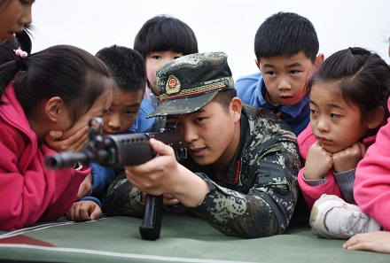 圖為武警合肥支隊(duì)執(zhí)勤一大隊(duì)?wèi)?zhàn)士向孩子們演示武器操作。