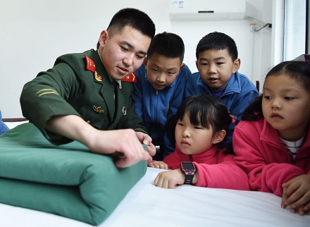圖為武警合肥支隊(duì)執(zhí)勤一大隊(duì)?wèi)?zhàn)士向孩子們演示疊被子。