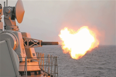 “戰(zhàn)斗警報(bào)!”編隊(duì)剛剛抵達(dá)目標(biāo)海域,參訓(xùn)某艦率先接到主炮對(duì)海射擊命令,迅速進(jìn)行戰(zhàn)斗準(zhǔn)備。“開(kāi)火!”指揮員果斷下達(dá)指令,炮彈呼嘯而出。隨后,編隊(duì)各艦集中火力,對(duì)海上目標(biāo)進(jìn)行打擊。海面硝煙未散,“敵機(jī)”又發(fā)起突襲,編隊(duì)迅速組成防空隊(duì)形展開(kāi)抗擊。