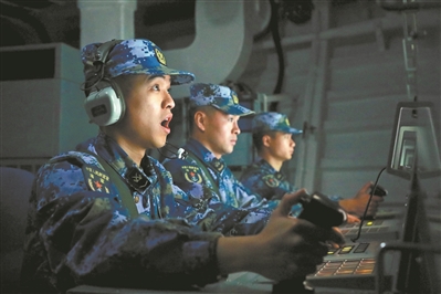 夜幕降臨,編隊(duì)轉(zhuǎn)入反潛訓(xùn)練。“方位××,距離××,發(fā)現(xiàn)金屬回音!”經(jīng)過(guò)仔細(xì)搜索,某艦發(fā)現(xiàn)“敵”潛艇,迅速通報(bào)編隊(duì)其他艦艇并對(duì)其實(shí)施打擊。