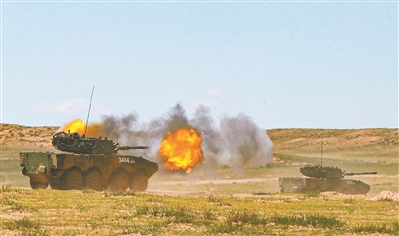 某型突擊車在機(jī)動(dòng)中對(duì)“敵”實(shí)施火力打擊。