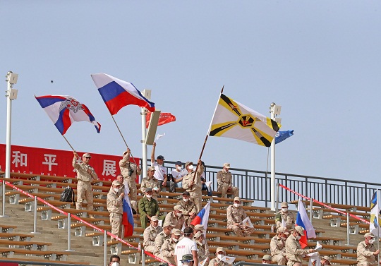 圖為8月22日,“國際軍事比賽-2021”中國庫爾勒賽區(qū)在“蘇沃洛夫突擊”比賽場正式開幕,觀賽官兵歡呼。張永進 攝