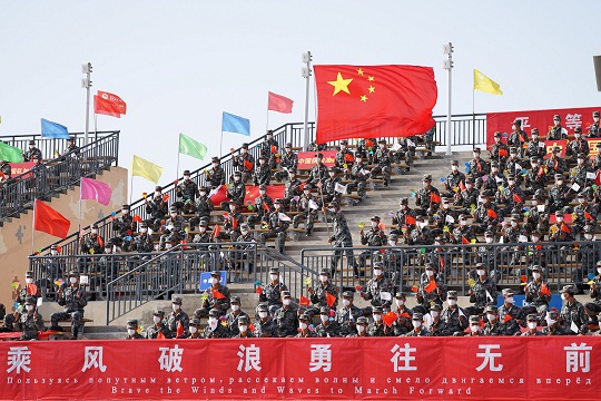 旌旗迎風招展,和平友誼同筑。白俄羅斯、埃及、俄羅斯、烏茲別克斯坦、委內瑞拉、越南參賽代表隊依次入場。當一面面不同國家的國旗通過觀禮臺時,現場官兵熱烈鼓掌,對遠道而來的參賽隊員表示歡迎。東道主中國參賽代表隊最后一個入場,參賽隊員們軍容嚴整、精神抖擻,在五星紅旗引領下通過觀禮臺。