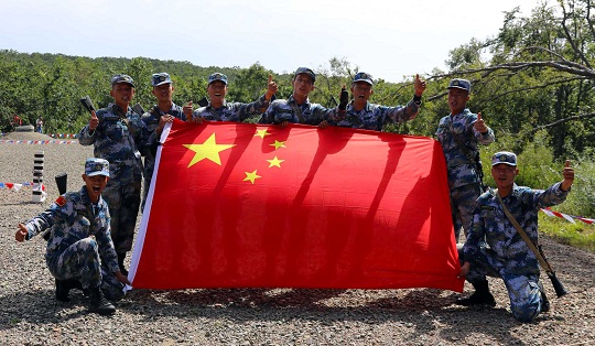 圖為中國(guó)參賽隊(duì)陸戰(zhàn)二班獲第三名后舉旗慶祝。肖勇利 攝