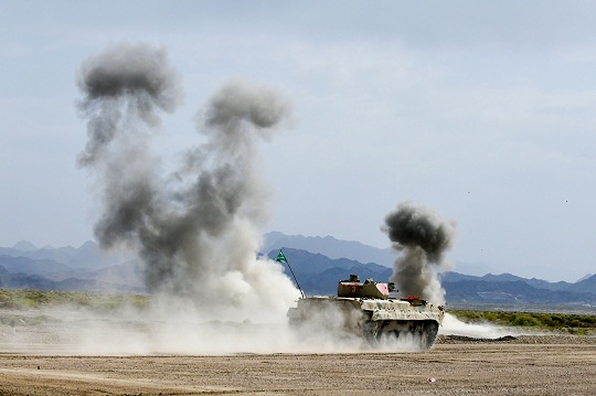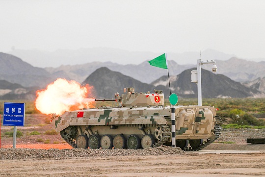 圖為中國(guó)參賽隊(duì)陸軍代表隊(duì)對(duì)步戰(zhàn)車(chē)目標(biāo)進(jìn)行實(shí)彈射擊。王俊 攝
