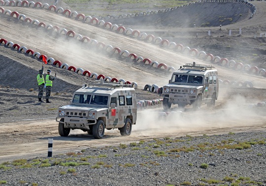 圖為中國(guó)陸軍參賽隊(duì)和烏茲別克斯坦參賽隊(duì)駕駛車輛飛速行進(jìn)。羅興倉(cāng) 攝