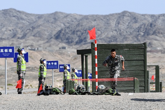 圖為“安全環(huán)境”項(xiàng)目舉行接力賽,中國(guó)陸軍參賽隊(duì)隊(duì)員通過(guò)獨(dú)木橋。 張永進(jìn) 攝