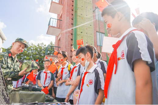 在營區(qū)“靶場”,各式槍械裝備整齊地擺在展示臺上。在教官帶領(lǐng)下,學(xué)生們很快掌握了武器使用基本原理和不同武器的使用效果和應(yīng)用場景。活動最后,學(xué)生和官兵們揮舞著國旗,大聲齊唱《我和我的祖國》。