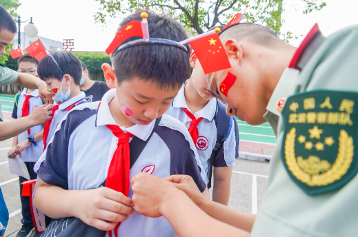 圖為武警戰(zhàn)士給學(xué)生貼上國旗貼紙,佩戴活動胸標(biāo)。