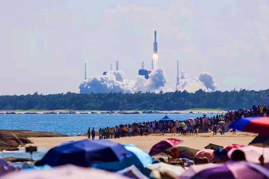 今年9月20日,海灘上、椰林旁、山頂上人山人海。伴隨著一陣山呼海嘯般的巨響,長(zhǎng)征七號(hào)火箭托舉著天舟三號(hào)貨運(yùn)飛船一飛沖天,中國(guó)空間站建設(shè)進(jìn)入承上啟下的關(guān)鍵一步。人們揮舞著國(guó)旗、高唱愛國(guó)歌曲、眼含熱淚,目送“天舟”奔赴太空。那個(gè)下午,騰飛的火箭與碧海藍(lán)天,歡呼的人群與紅色旋律,構(gòu)成了一幅中華民族探索浩瀚宇宙的壯美畫卷。