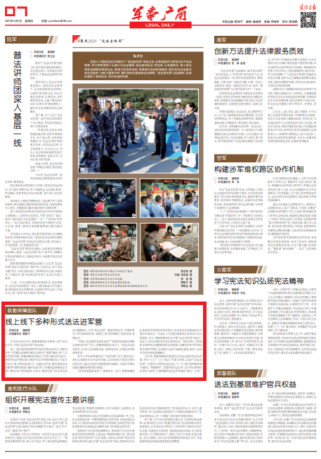 近年來,聯(lián)勤保障部隊(duì)把強(qiáng)化官兵法治意識(shí)和法治思維,作為“七五”“八五”普法工作重點(diǎn)來抓。在每年“憲法宣傳周”,開展形式多樣的送法活動(dòng)。下一步,他們將積極探索開通網(wǎng)上“聯(lián)勤律所”、加強(qiáng)軍地司法合作、加大軍隊(duì)律師隊(duì)伍培訓(xùn)力度等,打通聯(lián)勤特色法治軍營(yíng)建設(shè)“最后一公里”。