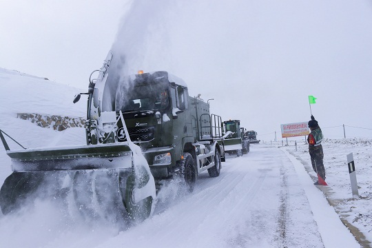 因災(zāi)害現(xiàn)場地處平均海拔4000多米以上海拔,持續(xù)降雪不斷,加之氣溫低至零下20多攝氏度,給整個道路搶通工作帶來了不少難度。為盡快清理路面積雪搶通道路,武警官兵采取“人歇機(jī)不停、分段搶通、先通后拓”的方法進(jìn)行全力搶通,克服了高寒缺氧及紫外線強(qiáng)烈等重重困難。