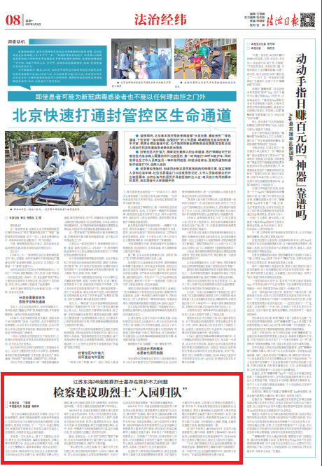 “我父親在海陵反蠶食戰(zhàn)役中犧牲,但由于當時戰(zhàn)事激烈,遺體只能就地掩埋,每到雨季我就憂心父親的墳塋會不會被附近的河流沖刷損毀,遷到陵園后,我再也不用擔心了……”近日,年逾古稀的烈士家屬周某專程致電江蘇省連云港市東??h人民檢察院,向檢察官表達由衷的謝意。