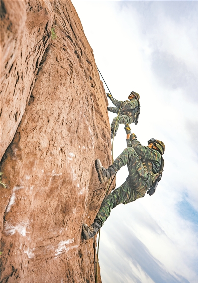 圖②:武警新疆總隊(duì)某支隊(duì)特戰(zhàn)隊(duì)員在反劫持演練中攀爬巖壁。余博 攝