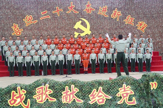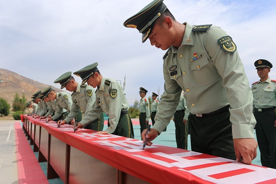 武警青??傟牂C動二支隊演訓(xùn)場上,官兵們跨彈坑、攀云梯、翻高墻……突然一聲哨響:全體集合!大家集體重溫入黨誓詞。之后,官兵在寫有“永遠聽黨話,堅定跟黨走,喜迎二十大,奮進新征程”的橫幅上寫下自己的名字。