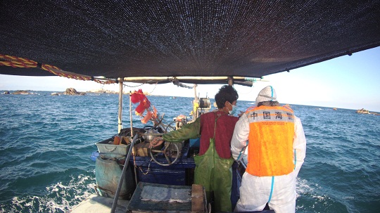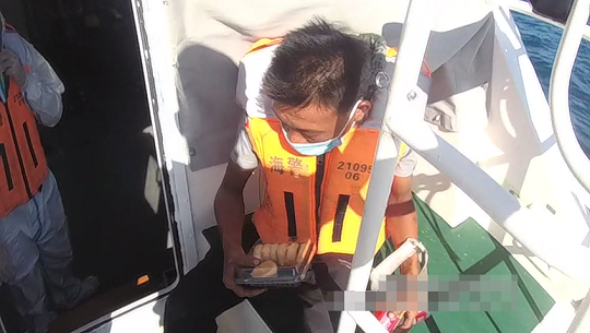圖為執(zhí)法員立即聯(lián)系當地漁民利用“小舢板”一同進行協(xié)助救援。