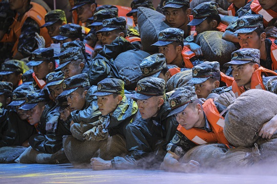 玉樹支隊(duì)上士何凱看著舞臺(tái)上重現(xiàn)2010年玉樹地震時(shí)的場(chǎng)景,手中雙拳緊握,“如果當(dāng)時(shí)我動(dòng)作再快一點(diǎn),一定能救助更多的受災(zāi)群眾?!碑?dāng)年參加抗震救災(zāi)時(shí)的新兵如今已是一名13年的老兵。