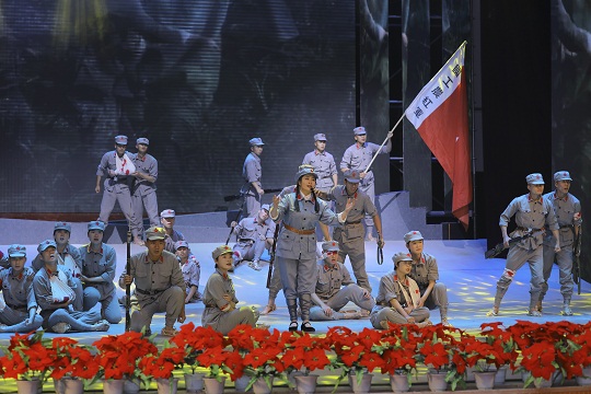 “活著走出草地,不讓一個(gè)人掉隊(duì)……”情景歌舞《活著走出草地》中的演員們有的頭纏繃帶,有的拄著樹枝拐杖,他們或嚼草根,或啃樹皮,聲情并茂得再現(xiàn)了1934年紅軍萬里長(zhǎng)征路上的艱難困苦,詮釋了人民軍隊(duì)為救國(guó)救民不惜犧牲一切的長(zhǎng)征精神。