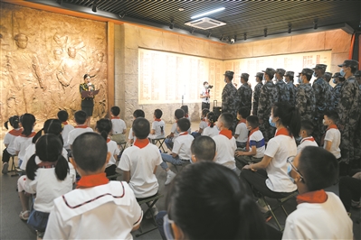 圖②:南昌警備區(qū)官兵和駐地學生在南昌八一起義紀念館的起義參加者名錄墻前學習參觀。徐婉攝