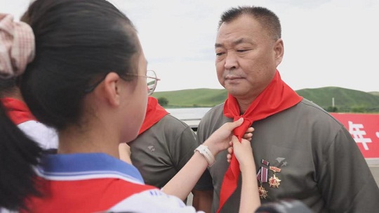 國門之下,革命老兵高舉右拳,神色堅毅,鏗鏘有力的誓言發(fā)自肺腑,“我志愿加入中國共產(chǎn)黨,擁護(hù)黨的綱領(lǐng),遵守黨的章程……”一字一句,莊嚴(yán)而神圣,面對鮮紅的黨旗,他們?nèi)詧允刂鴰资昵靶臅r的那顆初心,他們把自己的“紅色芳華”,獻(xiàn)給了革命事業(yè)。深受感動的學(xué)生們用最真摯的情感唱響紅歌,用最崇高的敬意為革命老兵戴上紅領(lǐng)巾,革命老兵也回敬標(biāo)準(zhǔn)的軍禮,承載著初心和使命的革命精神跨越時空,根植在學(xué)生們的心中?!皞鞒惺亲詈玫闹戮?,學(xué)生們只有堅守初心,傳承老一輩革命精神,好好學(xué)習(xí),做一個對國家有用的人,才能不負(fù)重托、不負(fù)期盼?!睘跆m浩特市第五中學(xué)教師王向英表示。