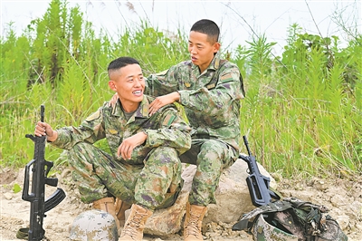 圖①:兄弟二人在戰(zhàn)友吶喊聲中進行小比拼。圖②:訓(xùn)練結(jié)束后,兄弟倆經(jīng)常交流心得。鄧居山 吳昊宇 攝影報道