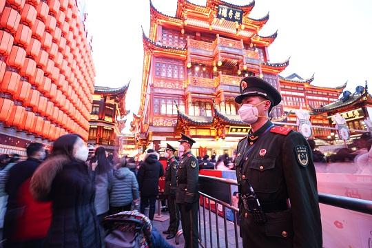 2月5日元宵佳節(jié),上海豫園張燈結(jié)彩、美輪美奐,一年一度的國家級非物質(zhì)文化遺產(chǎn)項目上海豫園新春民俗藝術(shù)燈會在此舉辦。節(jié)日恰逢周末,賞燈游園人群摩肩接踵。花燈下,武警上??傟牂C動第一支隊官兵堅守崗位,默默守護(hù)群眾平安賞燈。