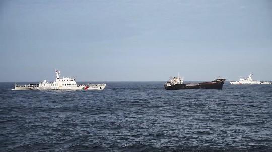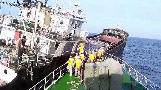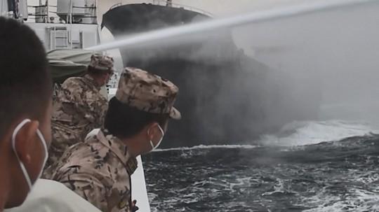 圖為嫌疑船只被4艘執(zhí)法艦圍堵,無路可退,最終停船接受檢查。