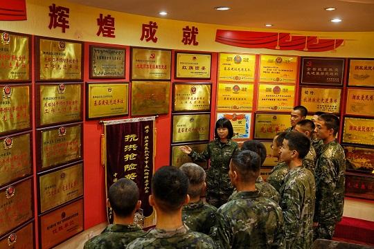 圖為武警陜西總隊(duì)漢中支隊(duì)勤務(wù)保障大隊(duì)副大隊(duì)長劉蕾在支隊(duì)史館為下隊(duì)新兵講述支隊(duì)建設(shè)發(fā)展歷程。李淼 攝