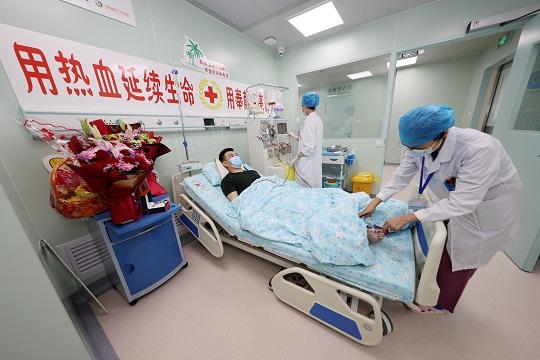 4月6日,海南省婦女兒童醫(yī)學(xué)中心采集室,血液順著針管,從武警海南總隊三亞支隊?wèi)?zhàn)士文濤(化名)的右臂流出,再通過血液分離機(jī)從右腳流回身體。此刻,文濤正靜靜地躺在病床上。