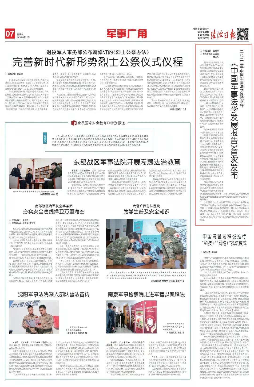 近日,記者從國(guó)防大學(xué)政治學(xué)院西安校區(qū)主辦的“2023年中國(guó)軍事法學(xué)論壇暨軍事法學(xué)創(chuàng)系育才30年學(xué)術(shù)研討會(huì)”上獲悉,中國(guó)軍事法學(xué)論壇連續(xù)7年發(fā)布年度《中國(guó)軍事法治發(fā)展報(bào)告》,并首次發(fā)布《中國(guó)軍事法學(xué)發(fā)展報(bào)告》。