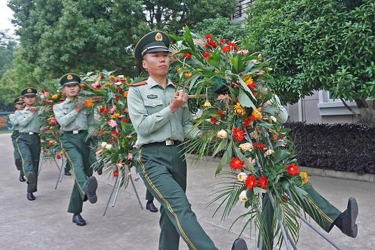 圖為李林雨(右二)參與“壬寅年世界華人炎帝故里尋根節(jié)”禮兵敬獻花籃任務集訓。武警湖北總隊供圖