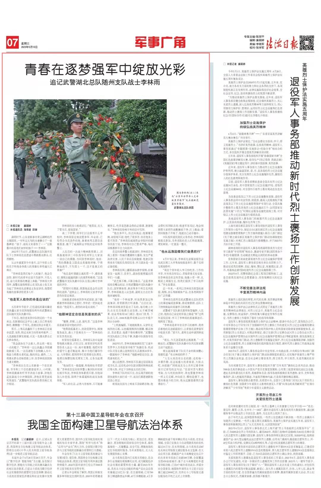 2022年7月12日,武警湖北總隊隨州支隊下士李林雨在巡邏途中勇救落水群眾,壯烈犧牲。